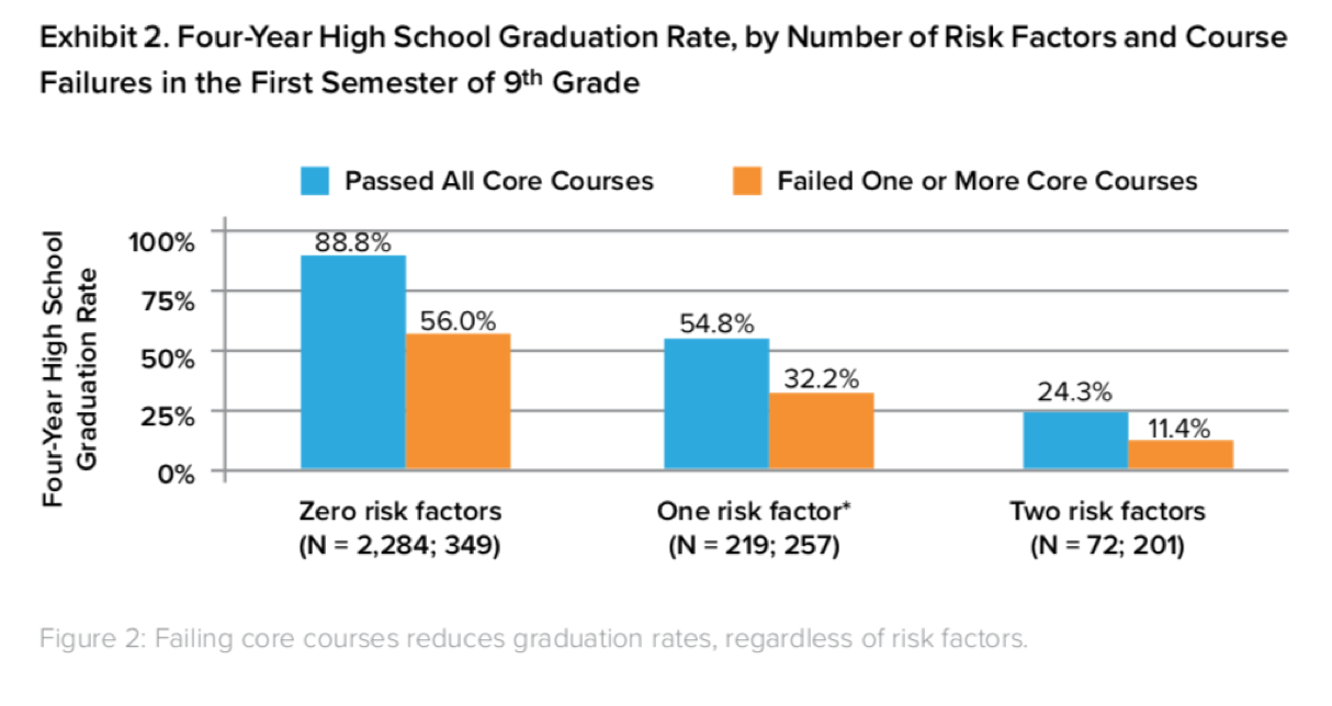 Support is also crucial throughout the first year of high school to ensure that all students stay on track. Figure 2 shows that, regardless of a student’s risk factors, academic success in the first semester of ninth grade has a significant effect on long-term success in high school.