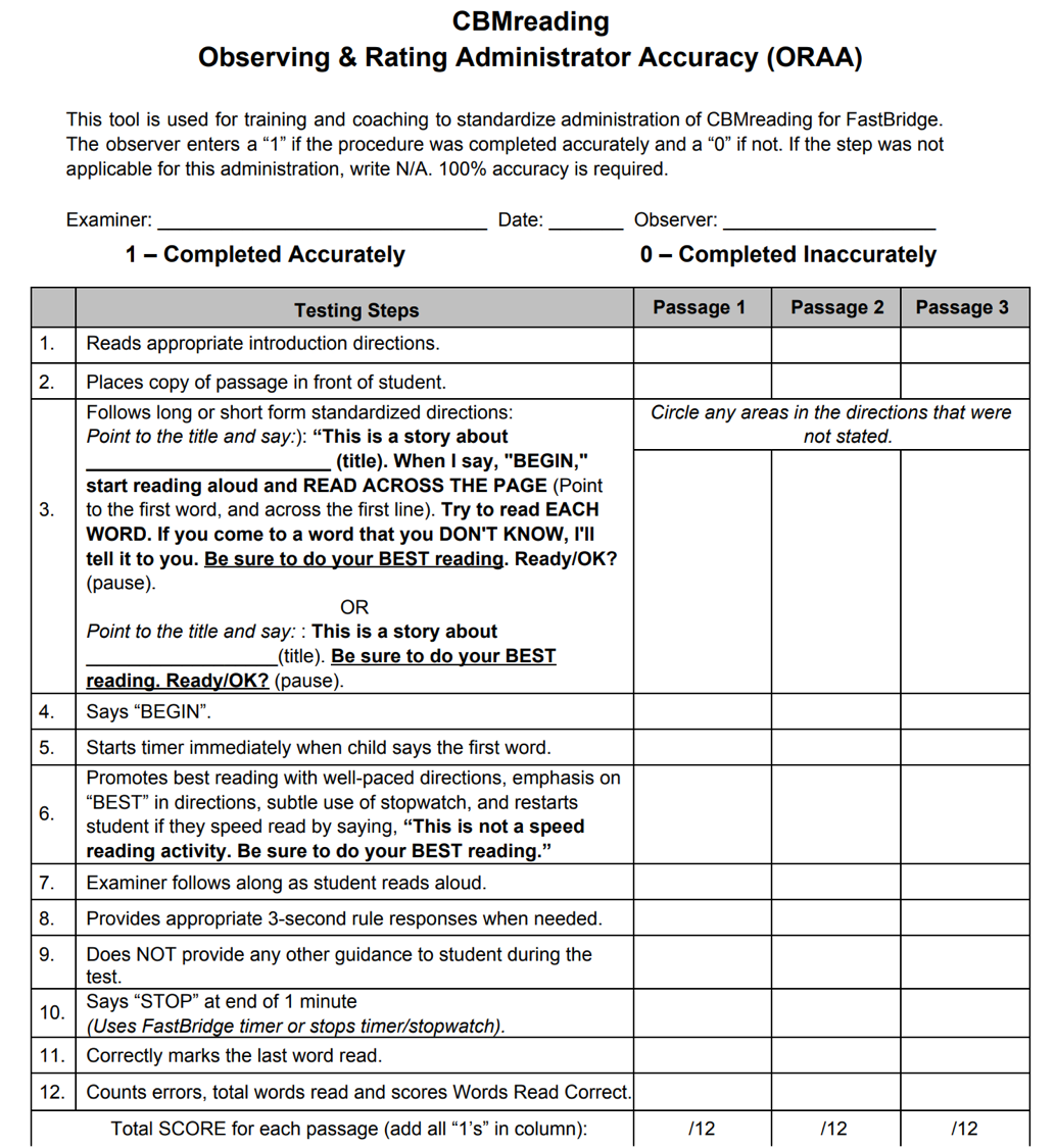 Checklists can also be helpful in documenting assessment integrity. Like interventions, many publishers include assessment procedure checklists. The FastBridge system includes a checklist for every FAST™ assessment. These checklists are known as the Observing and Rating Administrator Accuracy (ORAA) forms. (The ORAA forms are found in the Resources section of the online courses for each assessment.)
