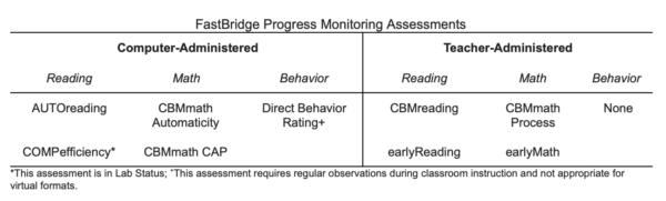 Between computer-administered and teacher-administered, it’s recommended that special educators use computer-administered assessments for remote screening and progress monitoring because the results are the most likely to reflect standardized procedures. If necessary,  teacher-administered assessments can be used and detailed guidance for how to do this remotely is available from Illuminate FastBridge.